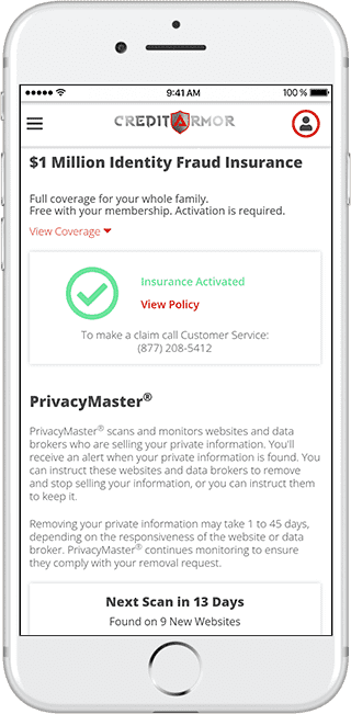 Is your data being used or sold on the web? Our PrivacyMaster® feature scans websites & data brokers for your personal information. Use the action button in your Alerts to quickly react to identity theft. Memberships also include $1 Million of whole family Fraud Insurance.